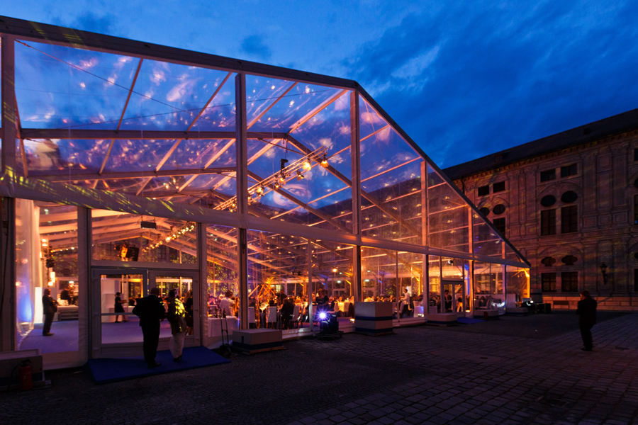 Gestaltung des Dinners in einem Glaspavillon im historischen Kaiserhof mit Raum- und Tischdekoration