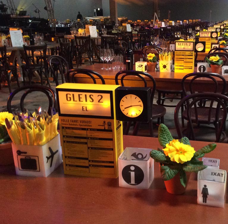 Konzept und Umsetzung einer Tischdekoration für 1800 Personen in Bahnhofs-Optik