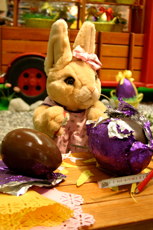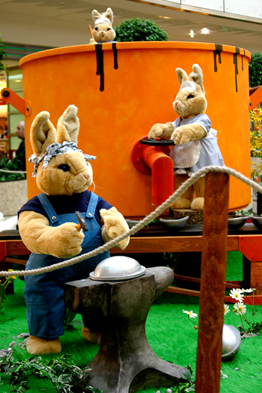 Um die Geschichte des Kakaos und der Schokoladenherstellung kindgerecht zu vermitteln, inszenierte COREOGRAFIA PRODUCTION eine Osterlandschaft mit passender Hasenfabrik und stellte auf spielerische Art und Weise die Produktion von Schokoladeneiern dar.